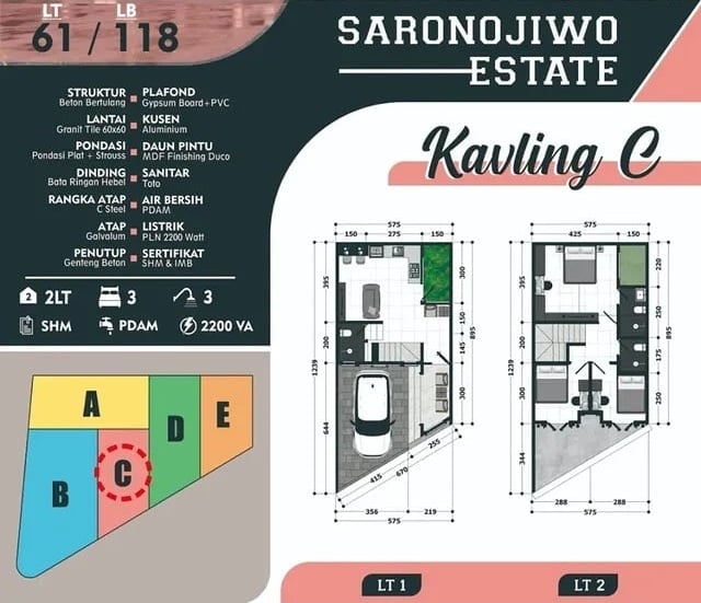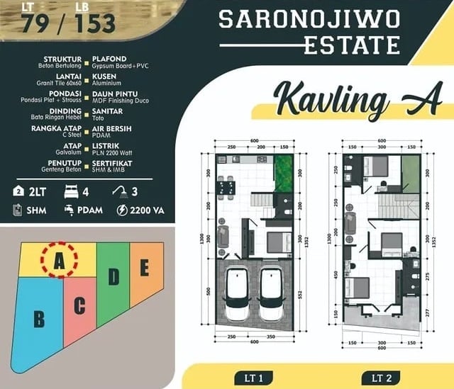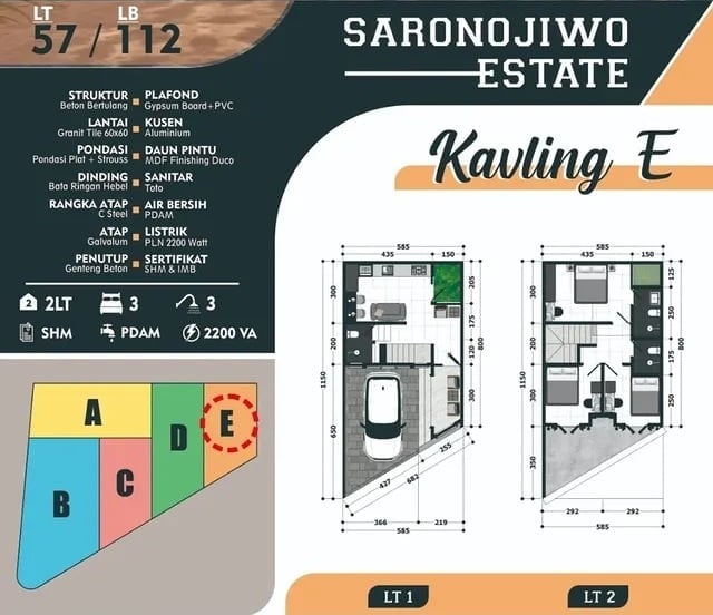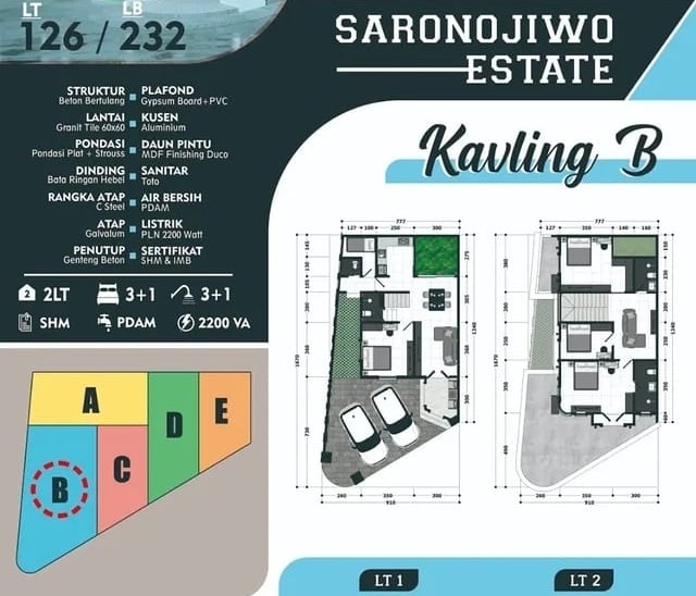 Pilihan kavling tersedia sesuai kebutuhan Anda, mulai dari LT 57 m² hingga 126 m², dengan luas bangunan maksimal 232 m². Semua rumah memiliki 2 lantai, carport, dan 3–4 kamar tidur. Berikut adalah detail masing-masing unit rumah: